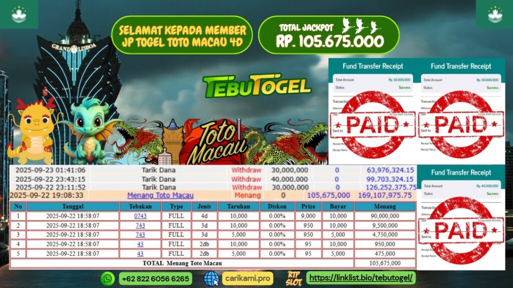 Selamat kepada User id : JAKA**** telah berhasil mendapatkan kemenangan besar pada permainan TOGEL TOTO MACAU 4D dengan kemenangan sebesar … Baca selengkapnya...