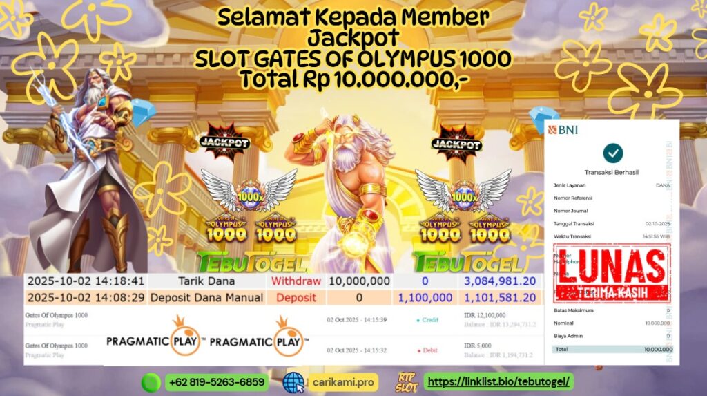 Selamat kepada User id : KUAT** telah berhasil mendapatkan kemenangan besar pada permainan SLOT GATES OF OLYMPUS 1000 DAN GATES … Baca selengkapnya...