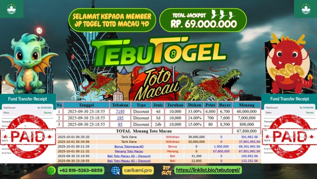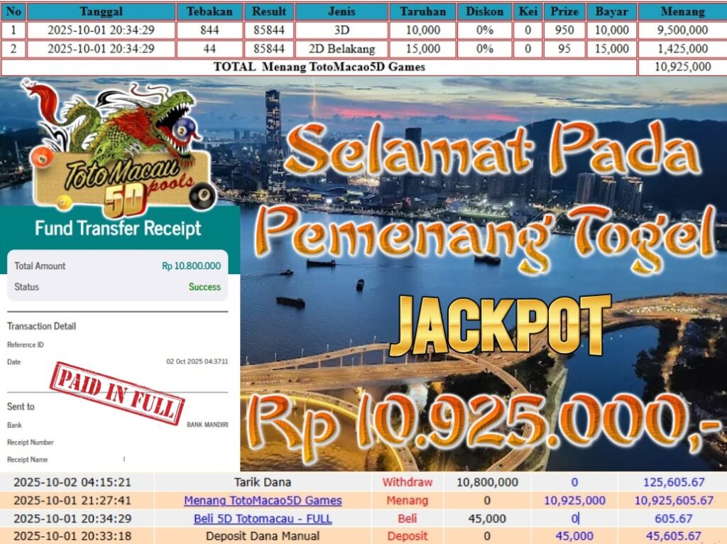 BUKTI JACKPOT TOGEL TOTO MACAU 5D Rp 10.900.000,- LUNAS